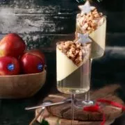 - Apfelwürfel mit dem Zitronensaft vermengen und auf den Pudding geben