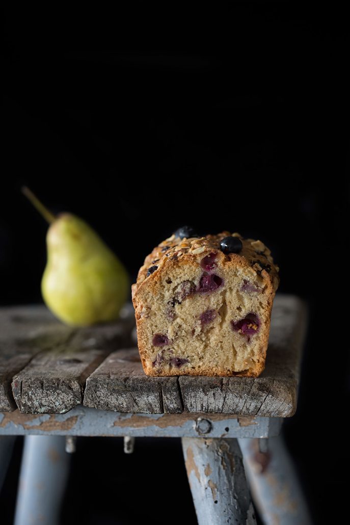 Der Kastenkuchen ist prall gefüllt mit fruchtigen Birnenstückchen und süßen Blaubeeren. Das macht ihn besonders saftig.