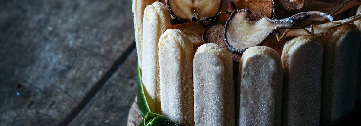 - Birnenscheiben bei 160 Grad Umluft im Backofen 40-50 Minuten backen, herausnehmen und vor dem Servieren auf die Birnen-Charlotte legen