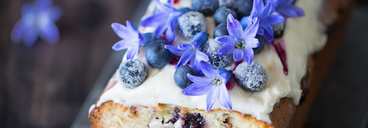 - Auf den abgekühlten Kuchen das Frischkäse-Frosting geben, das Püree auf den Kuchen verteilen und mit einer Gabel durchziehen und mit Blaubeeren garnieren