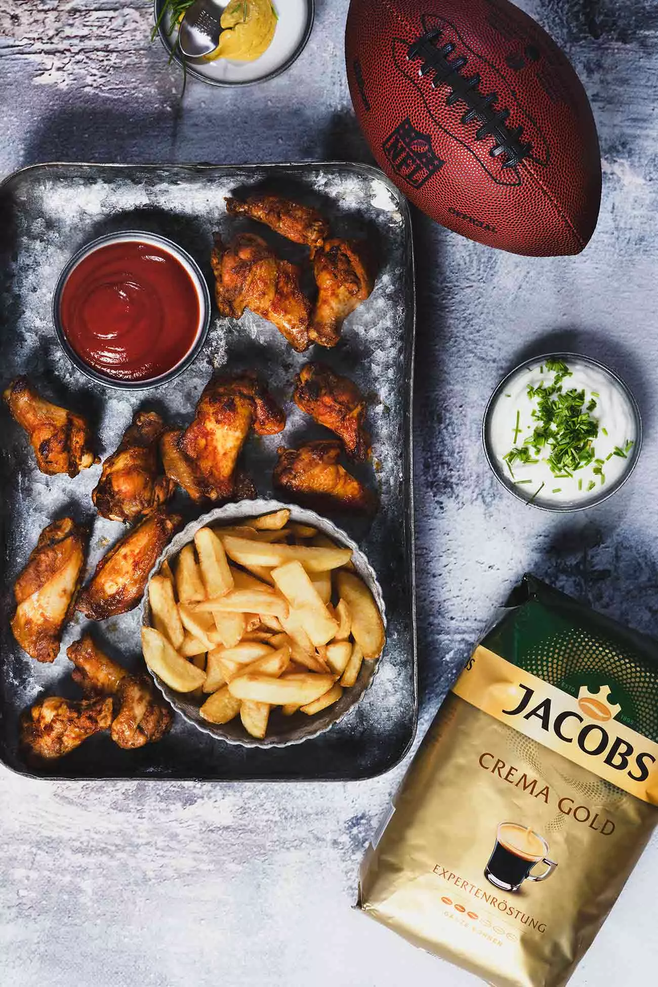 Und davon ganz viel. Da sind die lecker marinierten Chicken Wings mit einem kräftigen Schuss Jacobs Kaffee Crema Gold schon von Anfang auf dem Siegertreppchen. Und in der Halbzeitpause gibt es noch viele andere Leckereien.