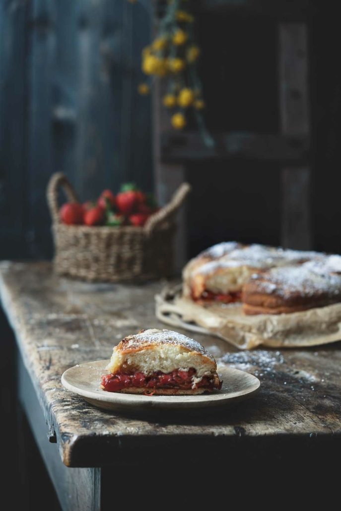 Fluffiger Hefeteig mit einer Erdbeerfüllung und Zuckerkruste.