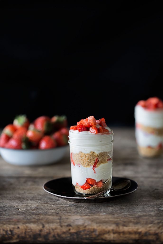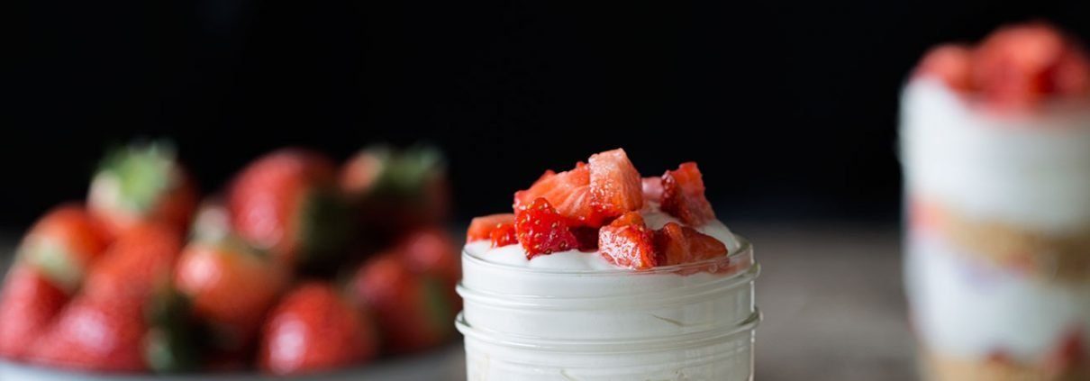 - Ein paar Erdbeeren auf den Salzbrezelboden in die Gläser geben und etwas Sahne-Schmandmischung aufgeben, gefolgt von 1 EL Salzbrezelmischung