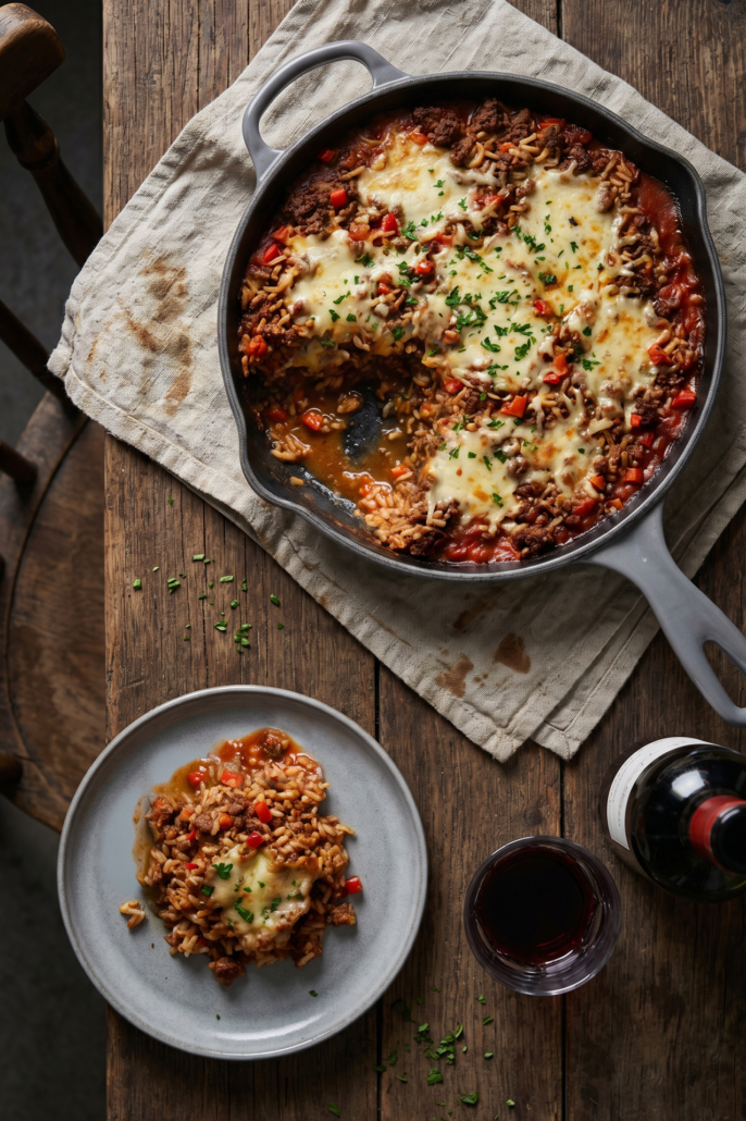 Der Käse zerläuft darüber wie eine sehr überzeugte Meinung, die Sauce schmiegt sich um Reis und Paprika, und am Ende löffelt man etwas aus der Pfanne, das schmeckt, als hätte jemand klassische gefüllte Paprika einmal von allem Befremdlichen befreit.