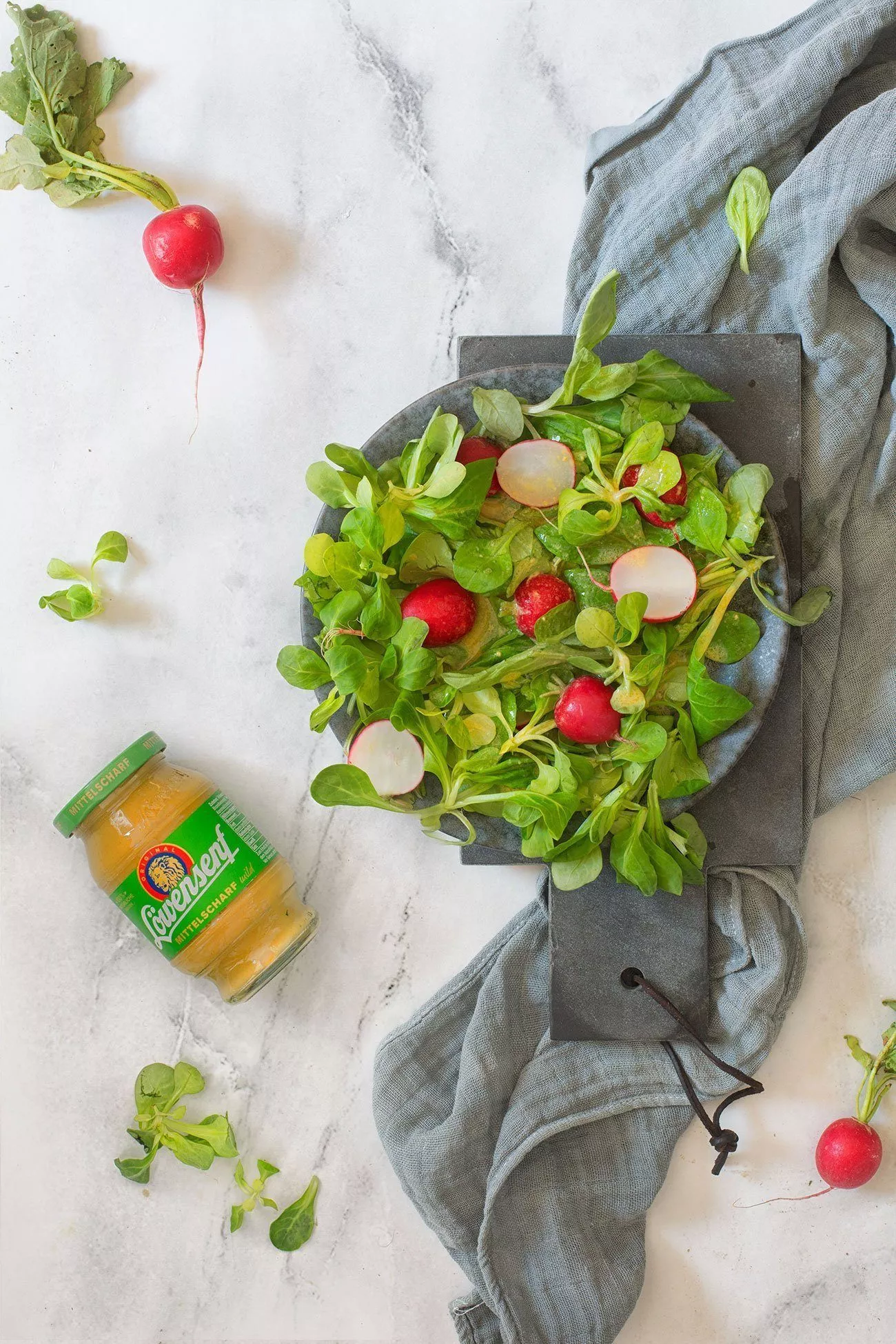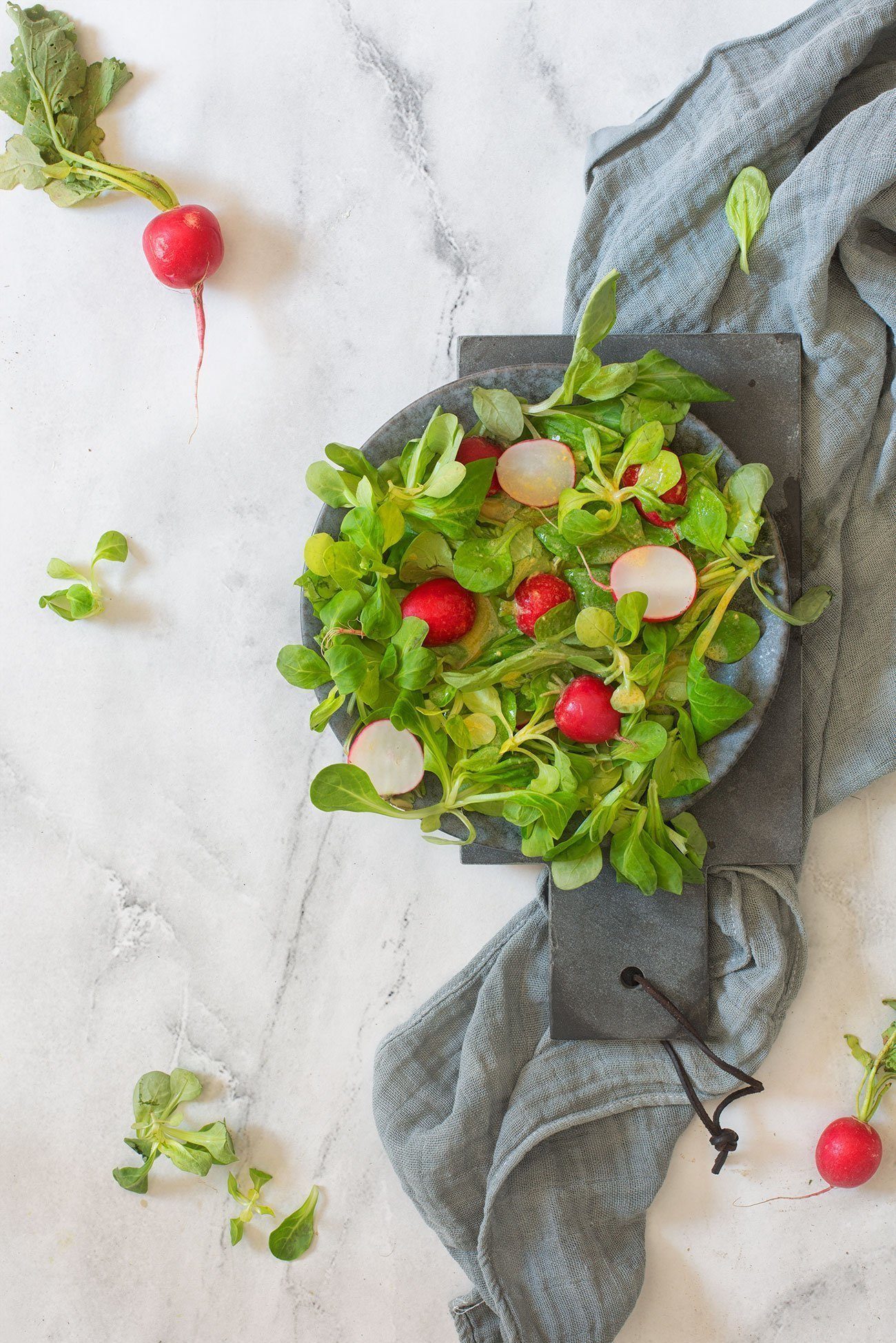 Hier kannst Du natürlich Deinen Lieblingssalat nehmen. Ich mag besonders die Kombination aus Feldsalat und Radieschen.