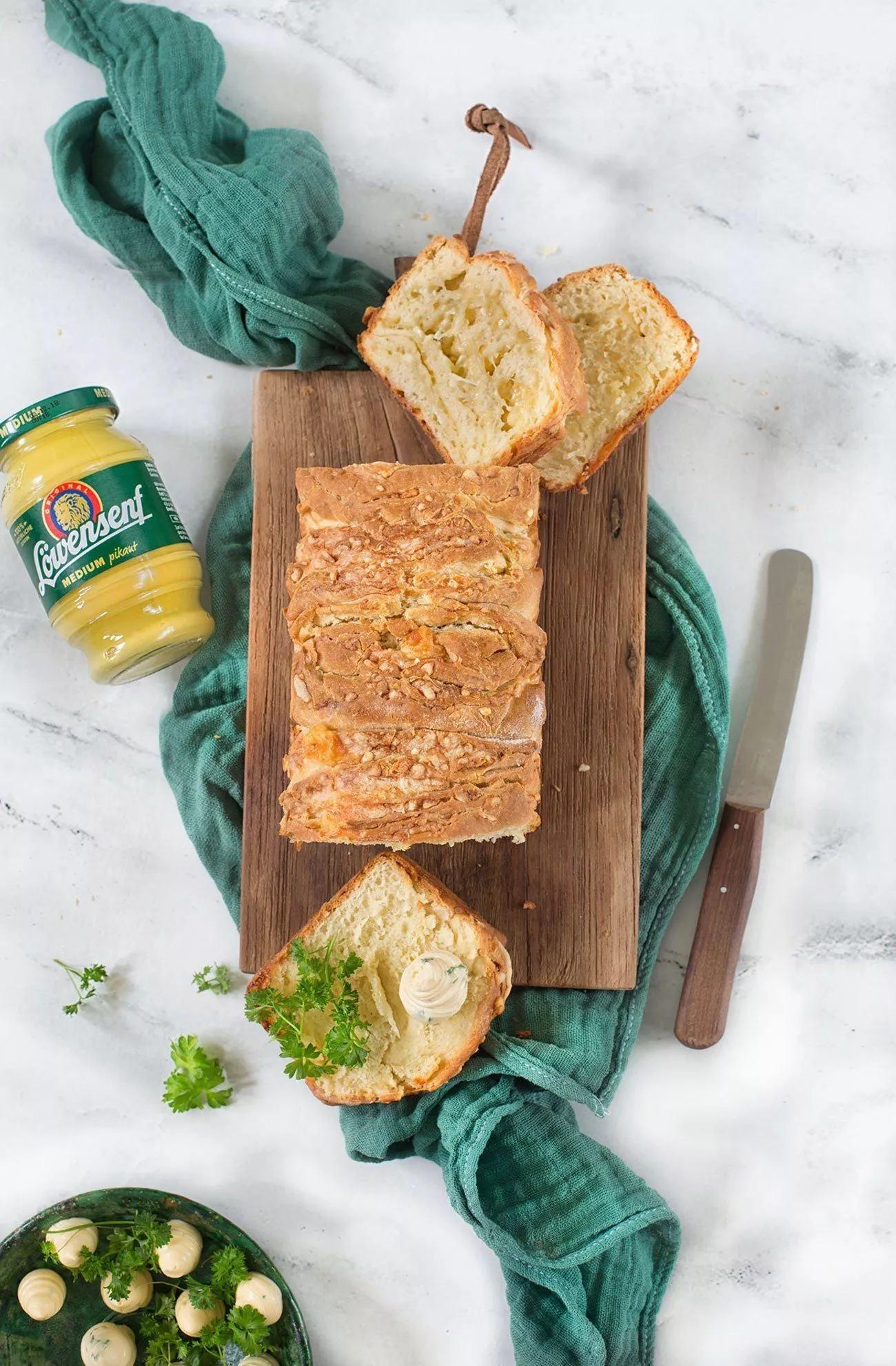 Pull-apart Senfbrot mit Bier und Käse