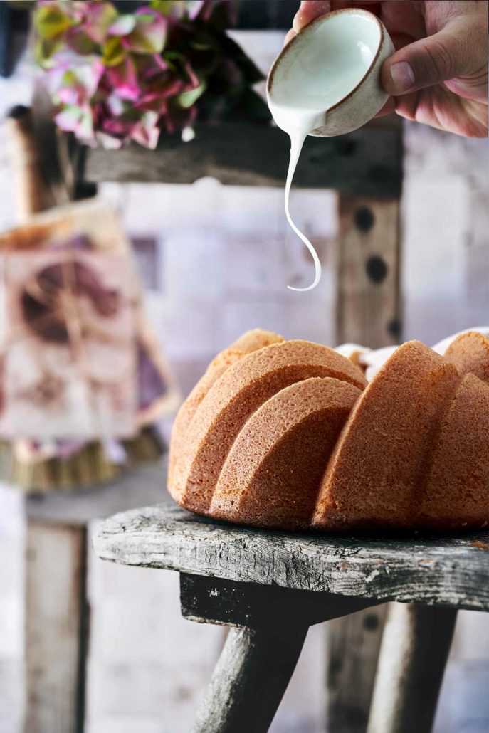 Mit der restlichen Flüssigkeit und Puderzucker eine dicke Glasur herstellen und über den Kuchen geben.