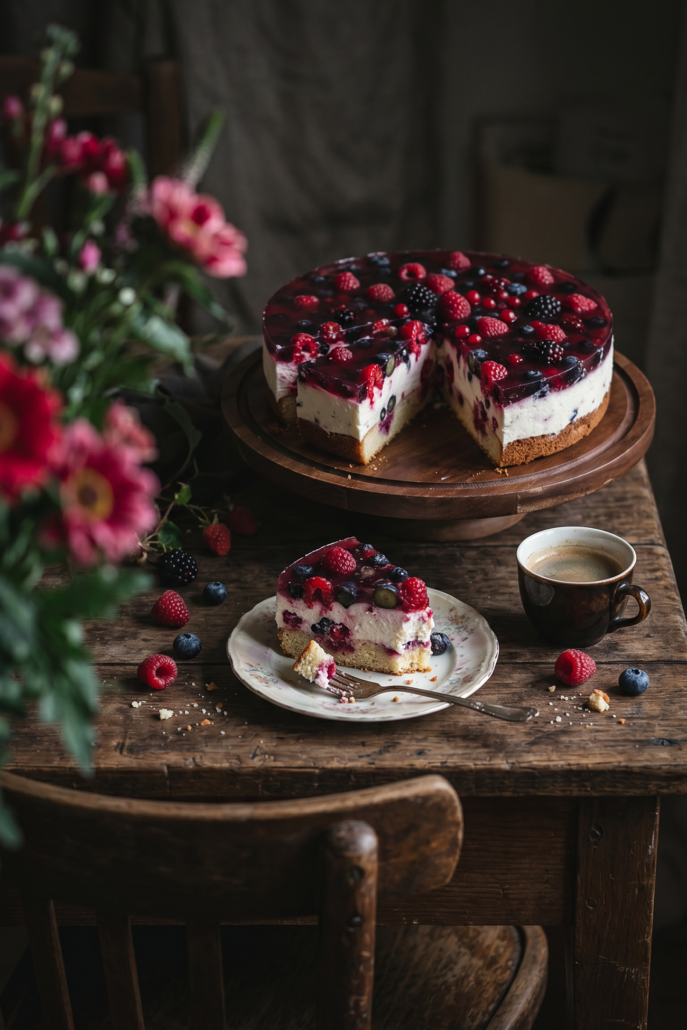 Man könnte natürlich sagen, es sei ein sommerlicher Joghurt-Beerenkuchen. Man könnte auch gleich einen Prospekt für Landhausgardinen schreiben. In Wahrheit ist das hier eher die Torte, die so aussieht, als hätte ein sehr gepflegter Obstgarten kurz die Fassung verloren. Himbeeren, Blaubeeren, Creme und Glanz unter Tortenguss. Und ja, natürlich muss der Kuchen gekühlt werden. Aber dann steht er da, glänzend, beerenschwer und unschuldig wie ein antikes Gemälde, das heimlich Zucker im Rahmen versteckt hat.