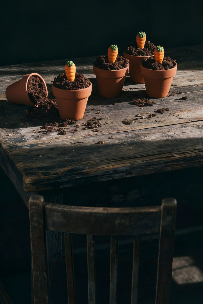 - Die beiden Muffins aus den Papierförmchen zerbröseln und als „Blumenerde“ auf die anderen Muffins im Tontopf verteilen, die kleinen Zuckerkarotten in die Mitte stecken.