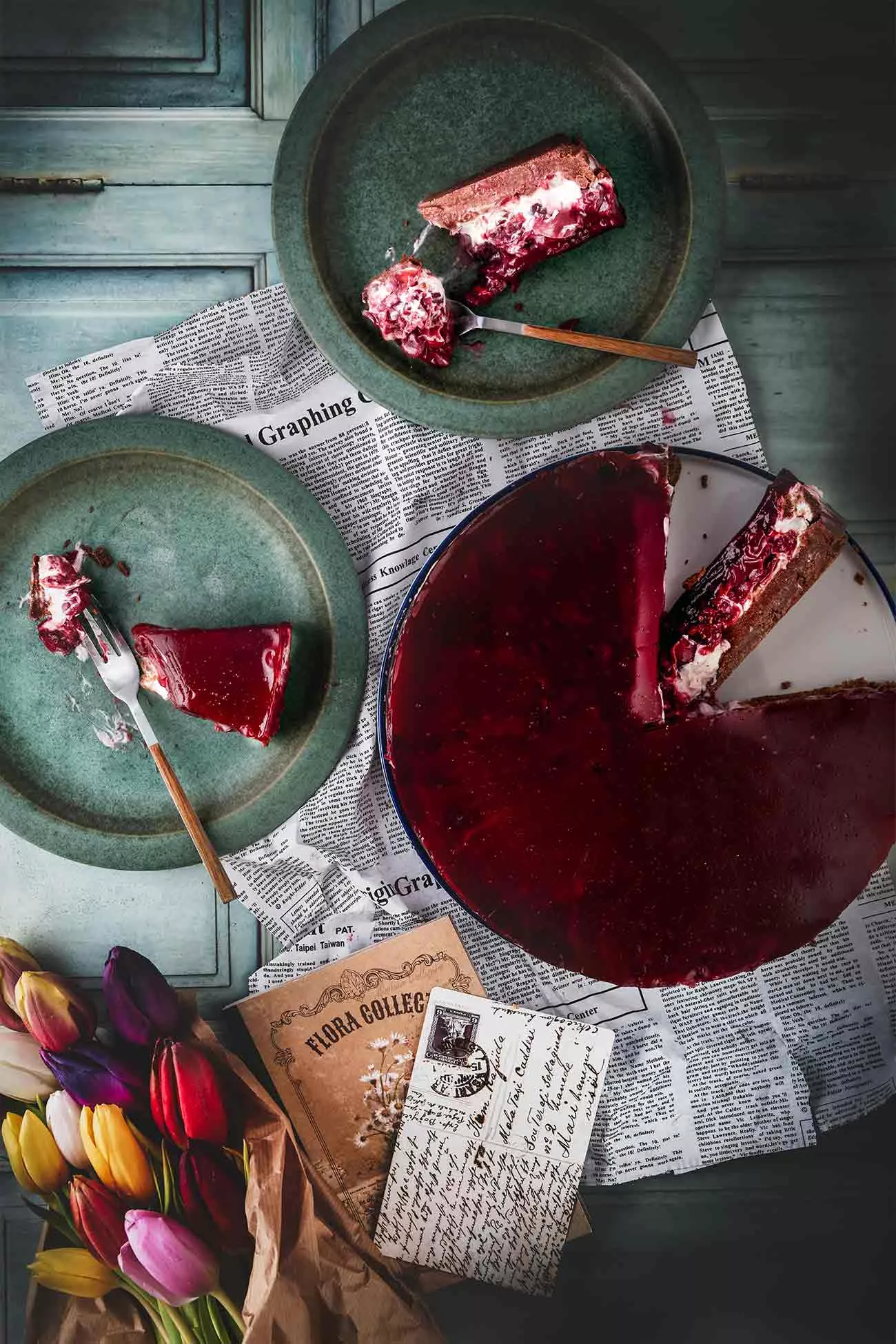 - Sauerkirschen gut abseihen, auf der Mascarponecreme verteilen und ca. 500 ml Kirschsaft auffangen (sollte das nicht reichen, mit Wasser auffüllen) und damit nach Packungsanleitung den Tortenguss herstellen. Tortenguss langsam auf den Kuchen verteilen und über Nacht im Kühlschrank festwerden lassen.