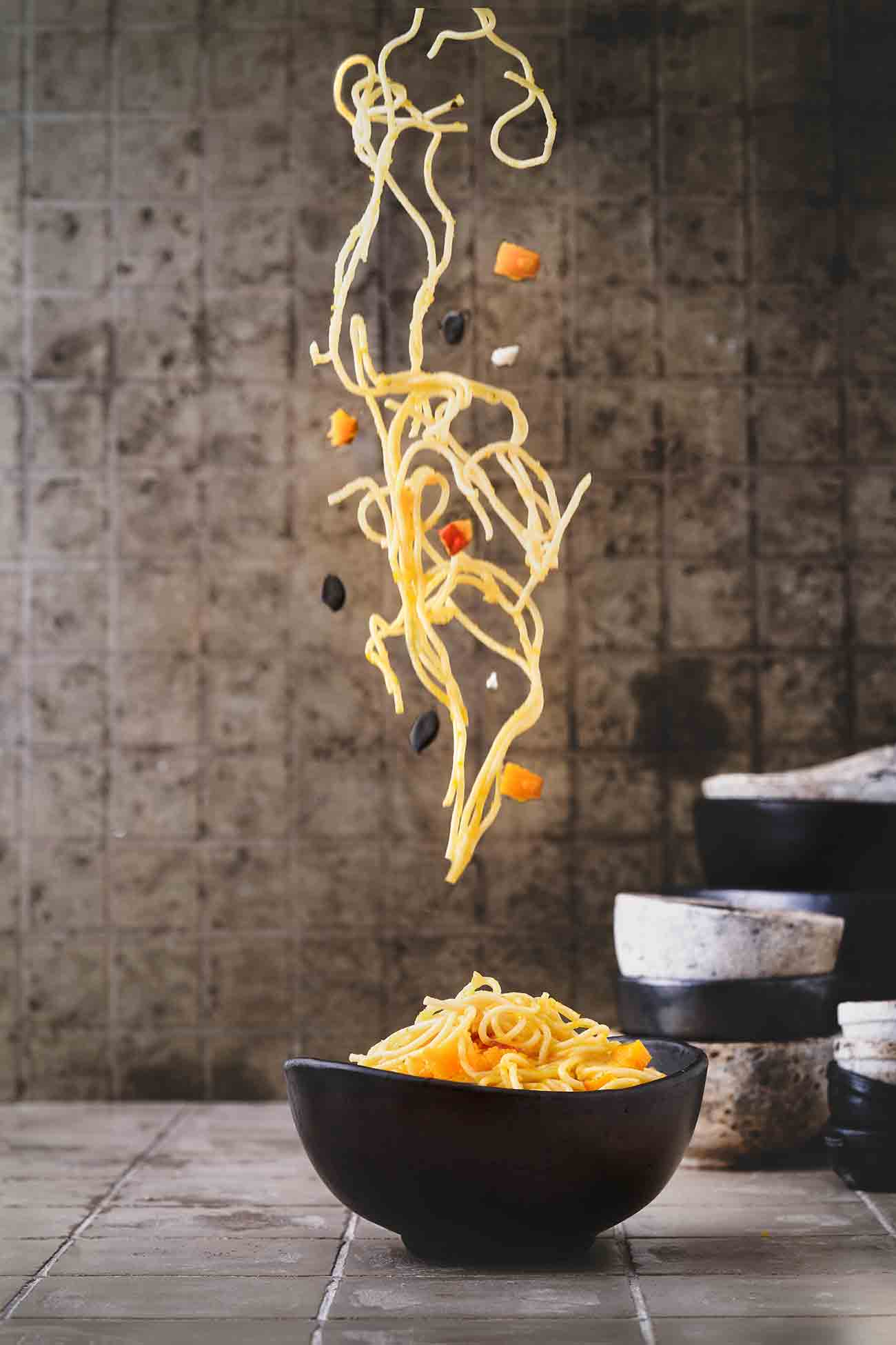 - Spaghetti mit dem restlichen Olivenöl, Hokkaido-Pesto, Kürbiskerne und Balsamico vermengen und mit Salz und Pfeffer würzen