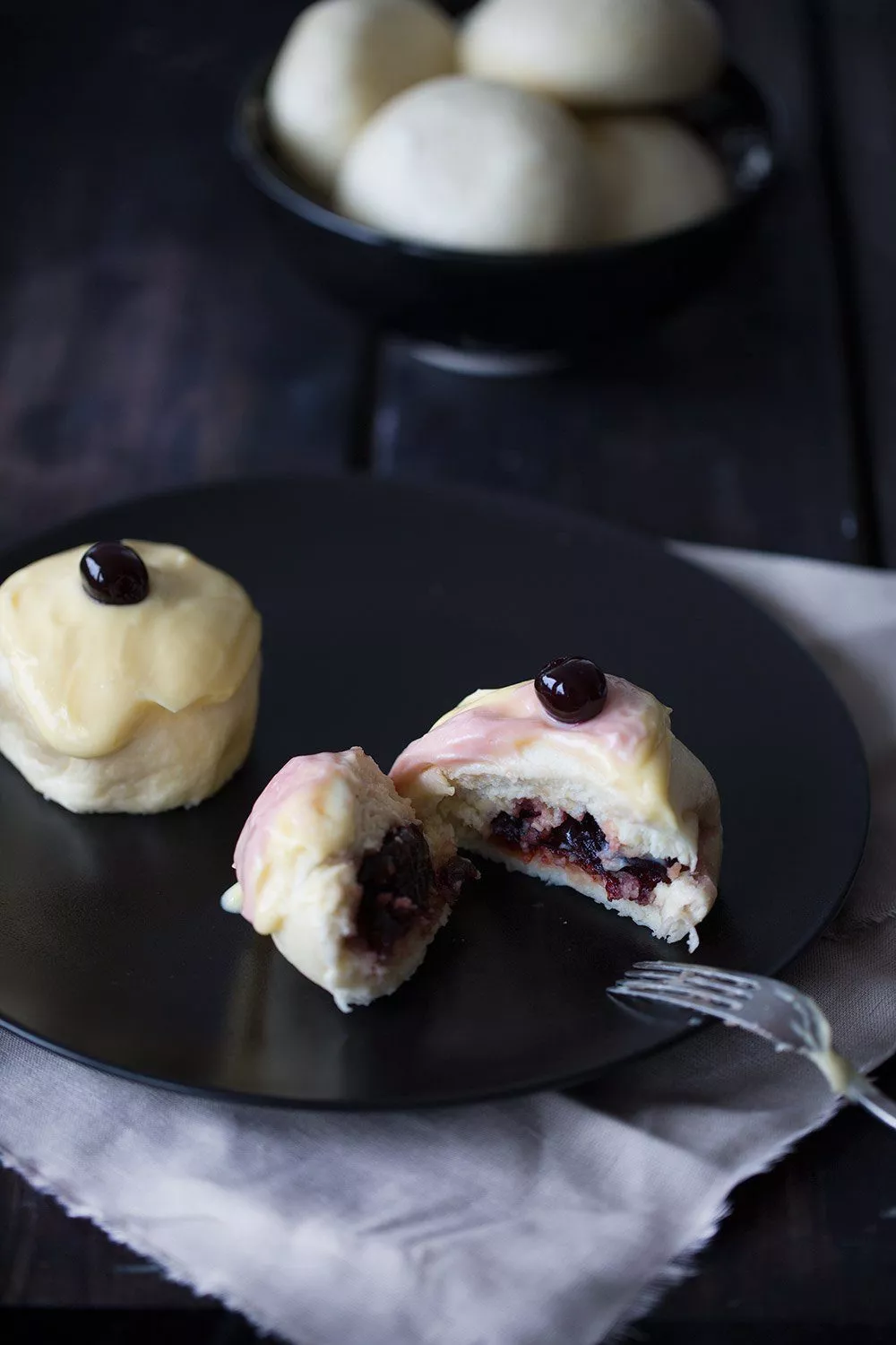 Süße gefüllte Hefeklöße mit Kirsch-Vanillesauce