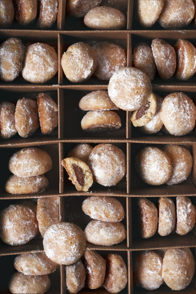 • Teigstücke flachdrücken, mit je einem Stück Nougat belegen und den Teig um das Nougat verschließen.