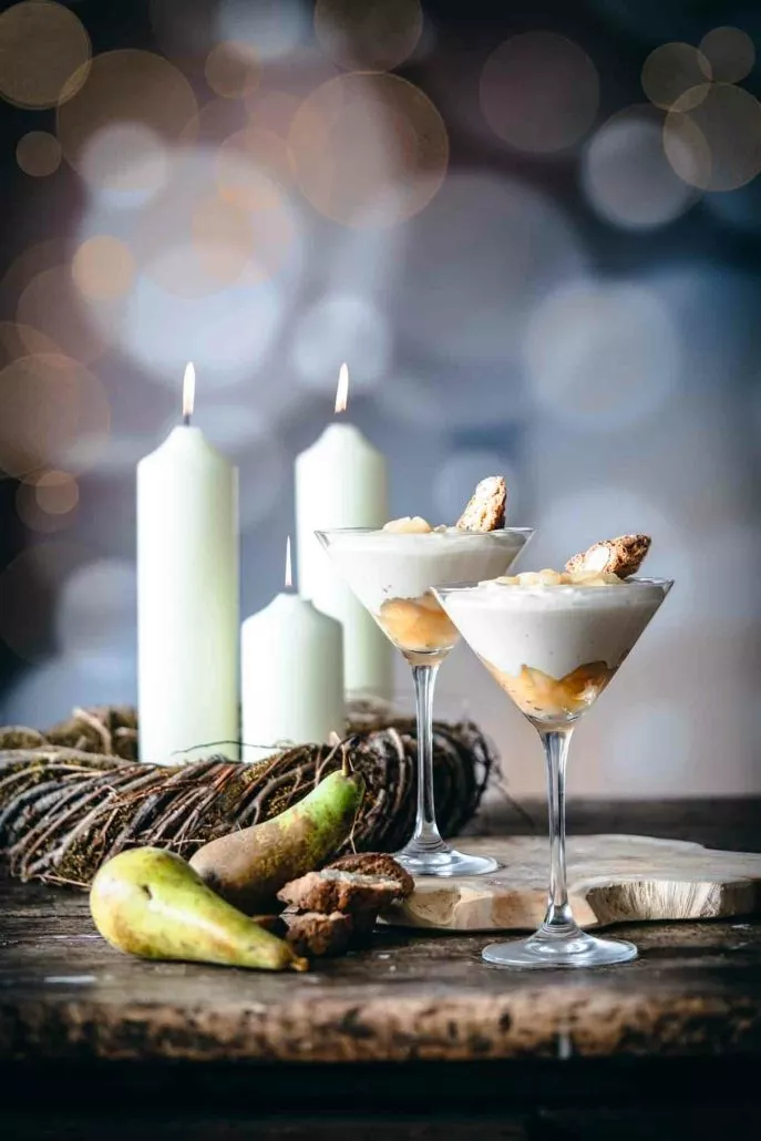 - In einem Glas abwechselnd Birnenkompott und weiße Mousse schichten und mit einem Biscotti servieren